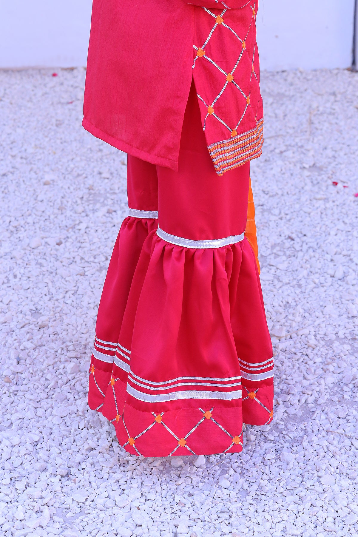 The Dull Silk Gharara provides a beautiful, fluid silhouette that adds volume and grace to your movements. The slight sheen of the dull silk gives it a soft, understated elegance that balances perfectly with the boldness of the color.